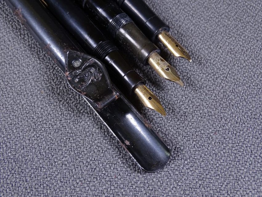 MABIE TODD - Vintage 1920s chased black hard rubber Swan Mabie Todd SF1 self-filler fountain pen (clipless) with Swan accommodation clip, gold trim, wide 18ct gold cap band (engraved WMY) and 14ct gold Mabie Todd and Co New York nib (No 2), in original box, a vintage (1910s-1920s) 'Swan' Metal Pocket - a means of carrying clipless pens, a vintage 1920s chased black hard rubber Swan Mabie Todd SF1 self-filler (Slim) fountain pen with Swan accommodation clip, gold trim and 14ct gold Swan nib (No 1) and a vintage 1930s chased black Swan Mabie Todd SM200/60 self-filler fountain pen with nickel clip and 14ct gold Swan nib (No 2)
