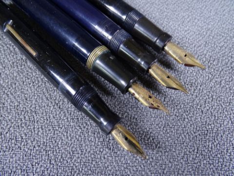 MABIE TODD - Three vintage (1930s-1940s) Swan Mabie Todd fountain pens with 14ct gold nibs, 1) dark blue 3220 self-filler pen with gold trim and 14ct gold Swan nib (No 2), 2) black SM 112B/60 self-filler pen with Empire-style stepped clip of the washer type with 14ct gold Swan nib (No 1), 3) dark blue unnumbered self-filler fountain pen with nickel trim and 14ct gold Swan nib (No 2) and a vintage 1940s Swan Mabie Todd self-filler fountain pen with gold trim, unusual decorative cap band and 14ct gold Swan nibs (No 2)