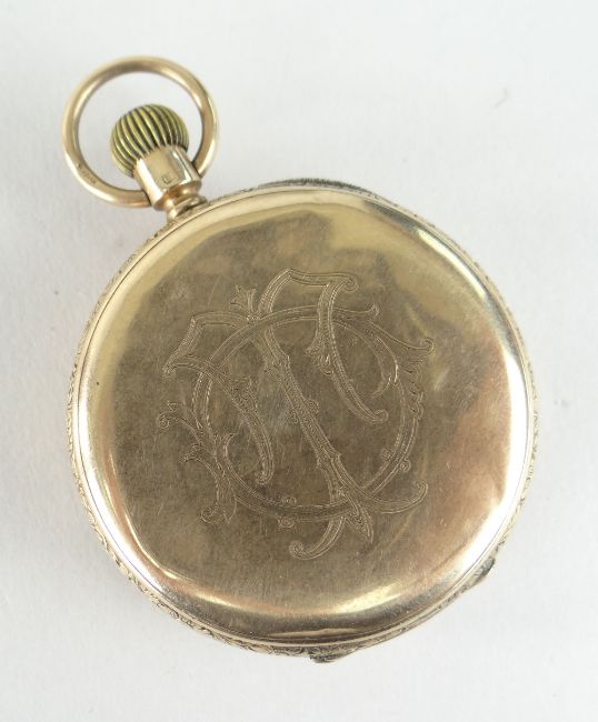 9CT YELLOW GOLD OPEN FACED POCKET WATCH with enamel face and Roman numeral chapter ring, engraved to inner cover 'Presented to Thomas Davies (Trainer) 1910', the movement marked 15 jewels, numbered 11334, 87.4gms