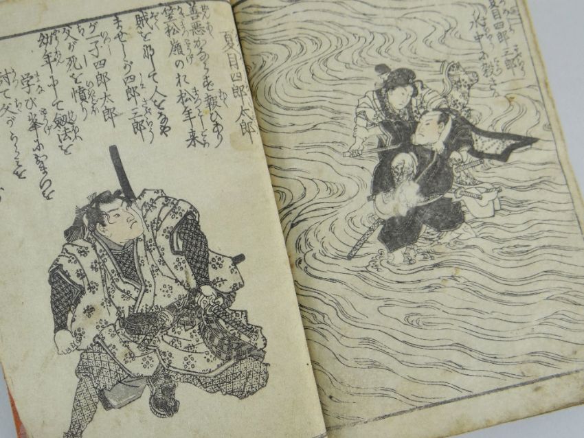 JAPANESE EHON (picture book) and a Chinese concertina volume 'The 24 Cases of Filial Piety' with wooden boards colour illustrations (2)