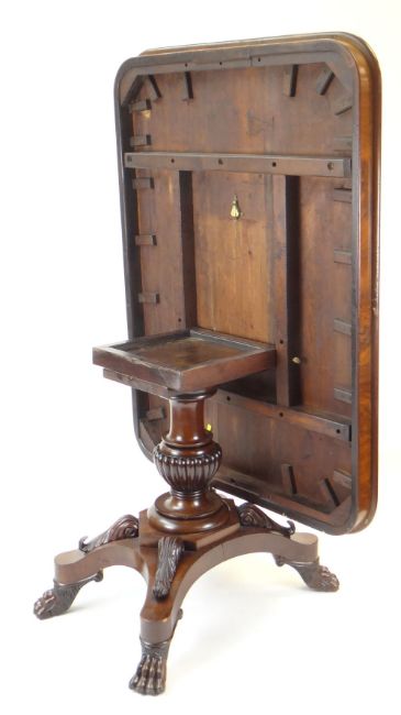 WILLIAM IV FLAME MAHOGANY BREAKFAST TABLE, rectangular tilt action top, on elaborate carved column and quadripartite base, 94 x 51 x 76cms