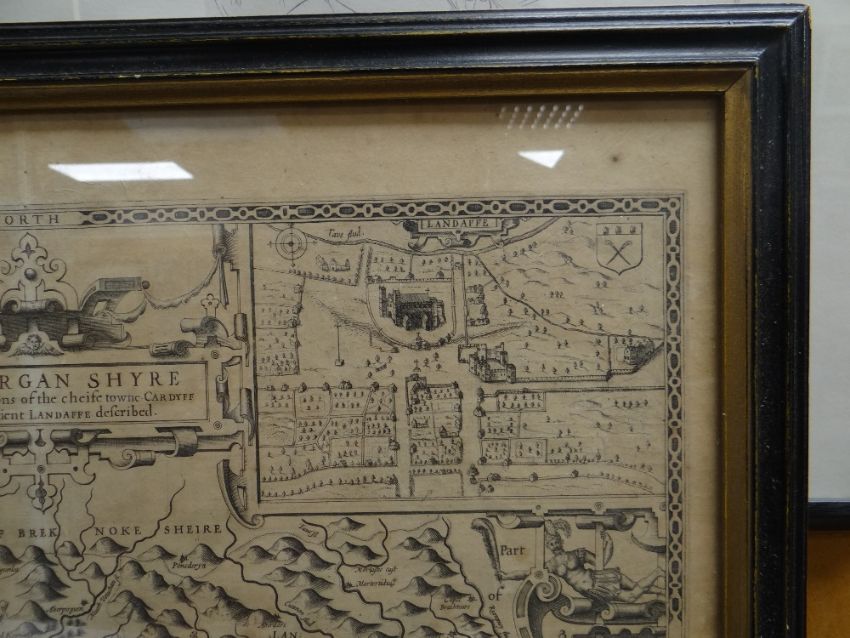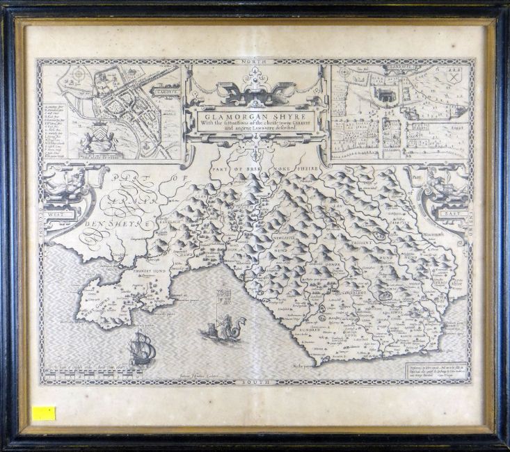 GLAMORGANSHIRE. Speed (John), Glamorgan shyre... published Sudbury and Humble circa 1611, uncoloured engraved map with town plans inserted, large margin, slight staining, 38.5 x 51.5cms, English text verso, framed and double glazed