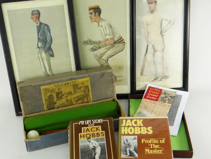 CRICKET MEMORABILIA to include three Vanity Fair prints (The Demon Bowler, English Cricket, A Tested Centurion - Jack Hobbs), two books profiling Jack Hobbs by Benny Green and John Arlott, boxed table 'Crickette' game and Godfrey Evans cricket game