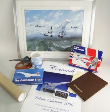 CONCORDE MEMORABILIA including die cast model, limited edition desk stand 'Queen of the Skies' 973/2450, various prints, china mug, stationary, luggage tie