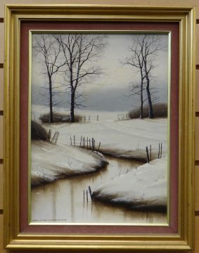 MICHAEL JOHN HILL (b.1956) oil on board - winter scene with river and trees, entitled 'Sussex in Winter', signed and dated 1986, 36.5 x 26cms