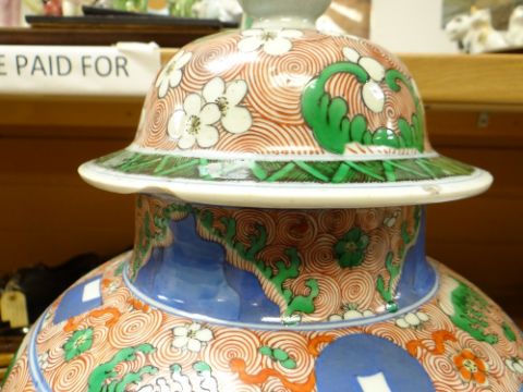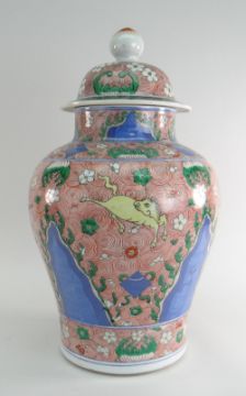 CHINESE WUCAI PORCELAIN BALUSTER JAR & COVER, in the Transitional style, base with apocryphal six character Wanli mark, 46cms high Condition report: Cover with several chips