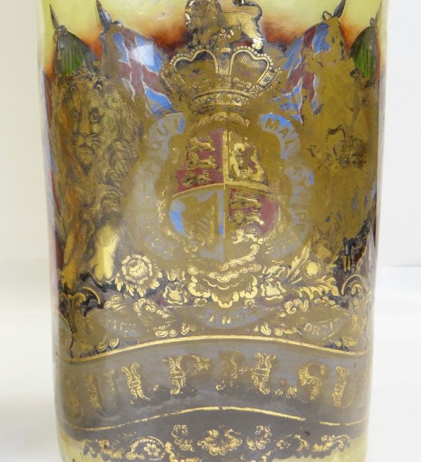 TWO VERY LARGE VICTORIAN GLASS APOTHECARY JARS & COVERS, gilt decorated with Royal Coat of Arms, one titled 'Sulph:Sub', the other 'P:Sodae.carb' (gilt and paint worn to inside), 86cms high