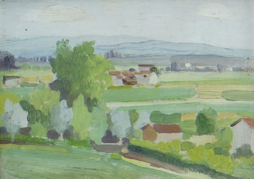 ADOLPHE VALETTE (1876 - 1942) oil on card - landscape, indistinctly signed, label verso for two Tib Lane Gallery labels, Manchester 1986, 12 x 17cms +Provenance: purchased by vendor's aunt from above gallery. Auctioneer's Note: Adolphe Valette was principal teacher at The Manchester Municipal School of Art during 1905-1907 and is known for strongly influencing the future painting style of L. S. Lowry. According to Cecilia Lyon, Lowry expressed his gratitude for Valette's contribution as follows 'I cannot over-estimate the effect on me at that time of the coming into this drab city of Adolphe Valette, full of the French Impressionists, aware of everything that was going on in Paris. He had freshness and a breadth of experience that was a very wonderful thing, as I saw it done by himself and his friends.' This small bijou painting most likely depicts a French landscape Condition Report: tiny holes to perimeter of card. Lots marked with + can be collected by Mailboxes Cardiff on Monday April 27th providing that full payment is made to us and Mailboxes by April 23rd. This will be the only collection by Mailboxes
