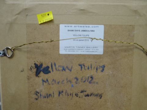 SHANI RHYS JAMES oil on panel - flowers in a jug with self portrait, entitled verso 'Yellow Tulips 2012', 18 x 12.5cms Provenance: 2013 purchase receipt from Martin Tinney Gallery.