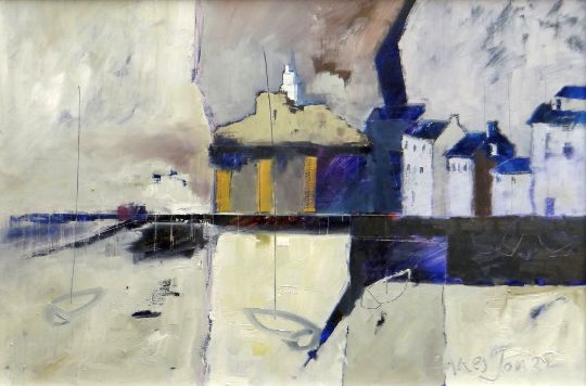 ALASTAIR ELKES-JONES oil on board - Swansea Bay with lighthouse, signed, 38 x 56cms