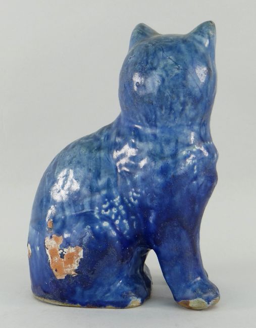 EWENNY POTTERY MODEL OF A SEATED CAT in mottled blue glaze, separate front legs, incised decoration including tied bow, untitled, 19cms high