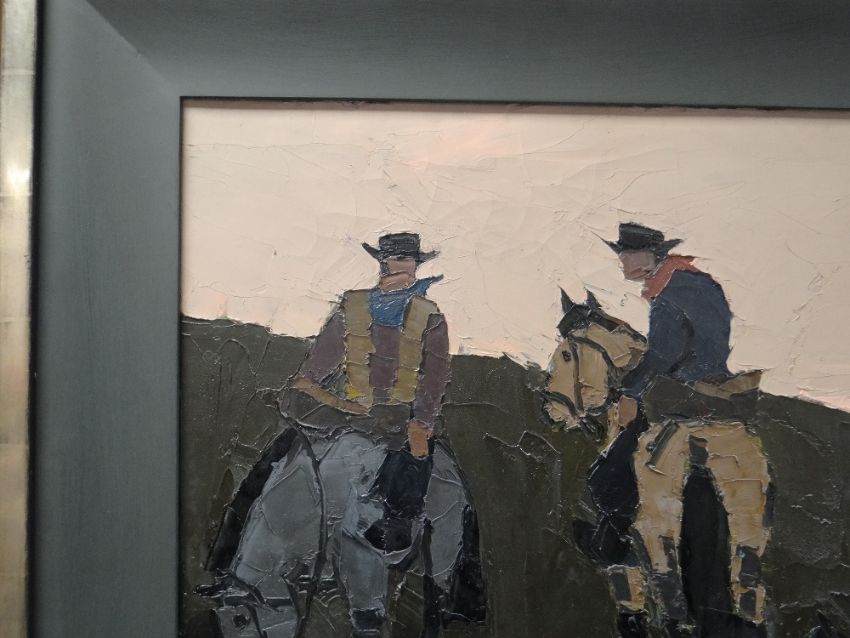 SIR KYFFIN WILLIAMS RA oil on canvas - two Patagonia gauchos on horseback with sheepdog under a pink sky, handwritten title verso 'Riders in Cwm Hyfryd 1970', signed with initials, 49 x 49cms