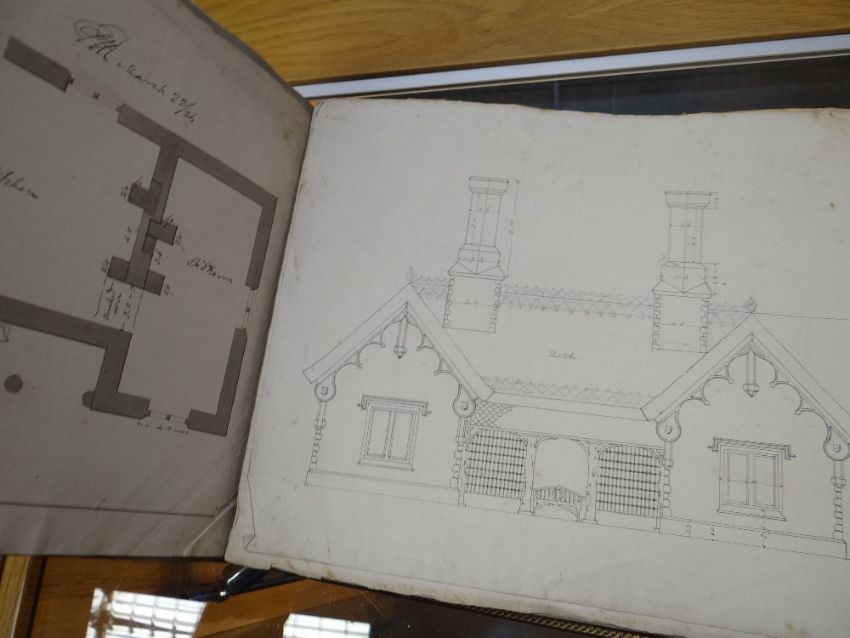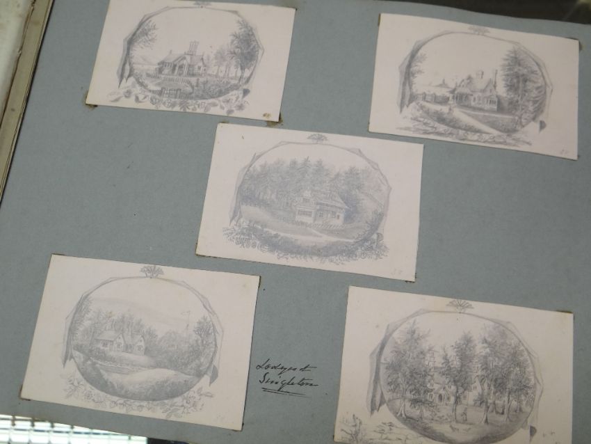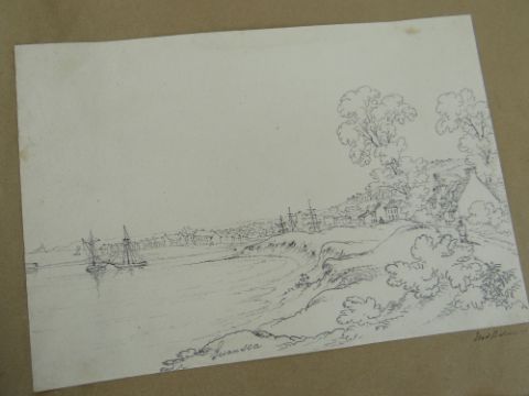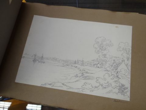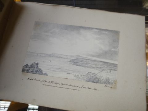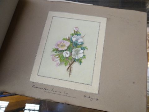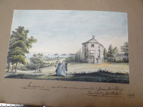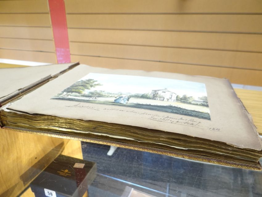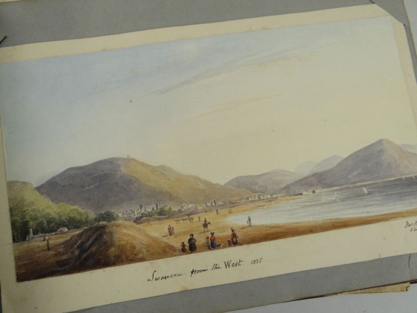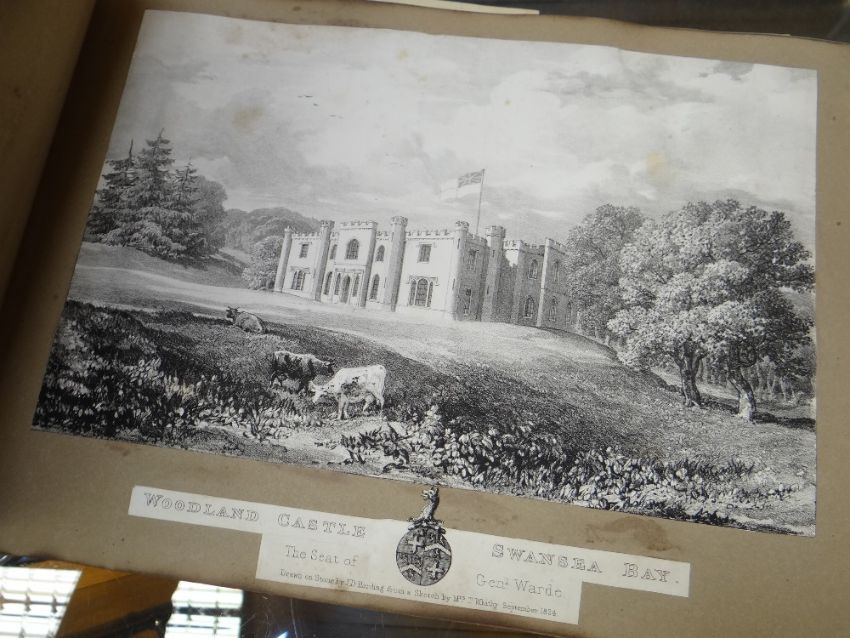 HISTORICAL NINETEENTH CENTURY ALBUM OF WATERCOLOURS & PRINTS RELATING TO THE VIVIAN FAMILY & SWANSEA AREA in gilded Morocco binding and titled 'Swansea Bay', most pictures with explanatory notes and dates, many comprising Vivian residences including watercolours of 'Marino 1816' and '...after alterations 1820', 'Singleton (Marino) 2nd Alteration', 'Lodges at Singleton', also noted 'A days fishing in Black Pill' and many sketches signed by Pitman (possibly John Pitman - fl.1814-1841) including 'Tricksy, Little Foxhound Terrier from Truro Kennel' a portrait of a standing greyhound named 'Venus' another of a horse and drawings of other animals, also signed Pitman 'Mumbles Light House - Bracelet Bay' and other local scenes to Swansea. Also noted, a watercolour of the Ladies of Llangollen riding side-saddle, signed M Lindsay, watercolours and drawings of local scenes by pioneering photographer and painter Rev Calvert Richard Jones, original pencil drawings by Singleton architect P F Robinson, sketch of local scene signed Townley, various portraits of ships, fine watercolour botanical study signed Mrs Withers etc Provenance: consigned directly from a member of the Vivian familyThere are approximately thirty to forty, most are watercolours, most of the book is full and most are titled.