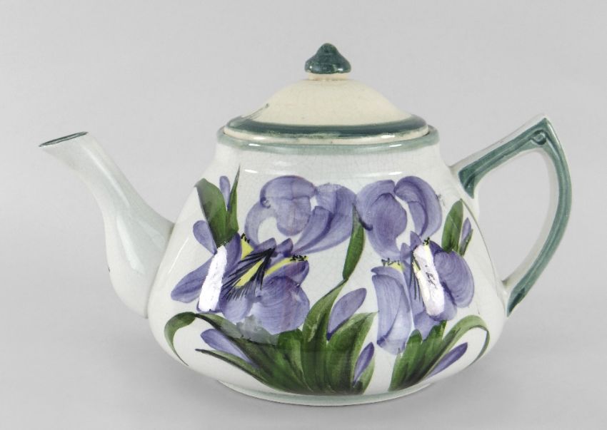 A LLANELLY POTTERY TEAPOT painted with purple irises, stencilled Llanelly to base, 21cms spout to handle
