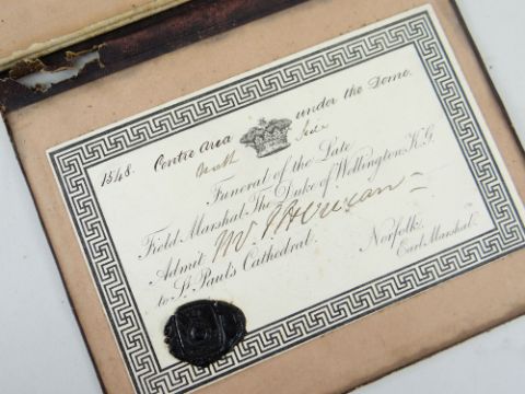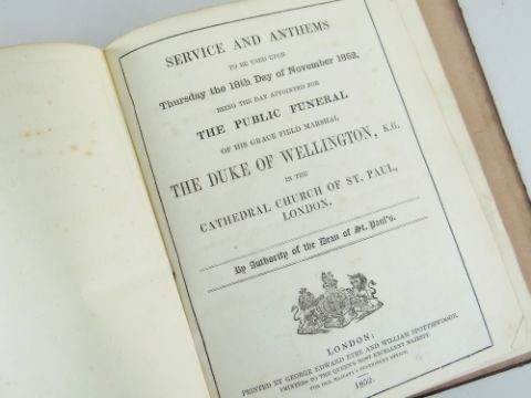 BOUND MATERIAL RELATING TO THE FUNERAL OF DUKE OF WELLINGTON 1852 comprising 'First and Second Reports from the Select Committee on the Funeral of the Duke of Wellington - Ordered by the House of Commons....1852', 'Services and Anthems' booklet printed by George Edward Eyre and William Spottiswoode, and stuck-down on the inside of the cover an admission card for the funeral, addressed to John Henry Vivian, to be seated 'Centre area under the Dome' with Speaker of the House of Commons' black wax seal, gilt initials J H V to cover