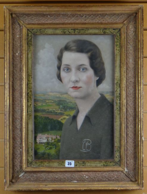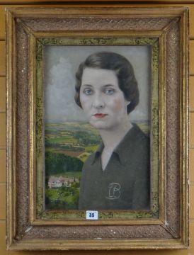 BRITISH SCHOOL mixed media - head and shoulders portrait of a lady with landscape and house behind, entitled verso 'Ursula Margaret Vivian (1911-1963) eldest daughter of Odo Richard Vivian, 3rd Lord Swansea...', unsigned, 43 x 28cms