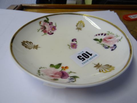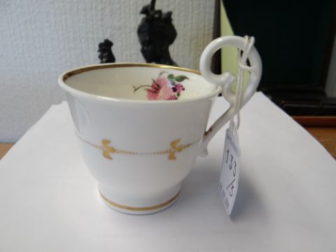 A NANTGARW PORCELAIN TRIO the two footed cups having elevated loop handles, each element painted with flower sprays and gilt palmette motifs, saucer 14cms diam Condition Report: no apparent problemsNo chips or cracks to either cups or saucer, gilt rims slightly worn to all three. Base of saucer has glued labels.All three with attached Sotheby’s lot numbers.