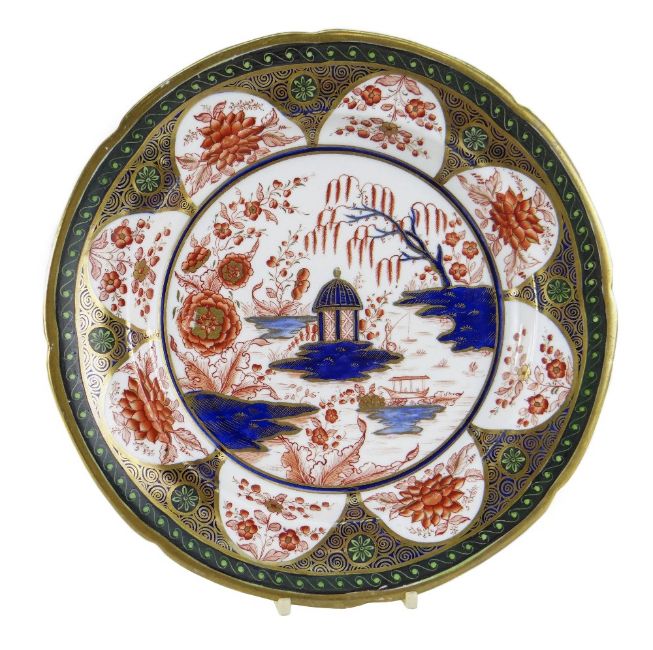 A SWANSEA PORCELAIN GAZEBO PATTERN DISH decorated in the Japan style with interior landscape featuring stylised river scene with fishing boat, the border with eight arched panels of rust foliage to a green and gilded scrolled border, 24cms diam