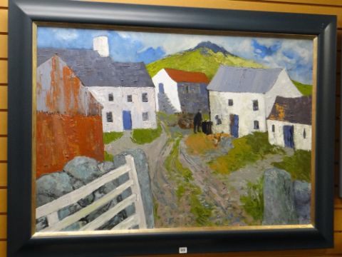 GWILYM PRICHARD oil on canvas - hillside farmyard with figure and poultry, entitled verso on Martin Tinney Gallery label 'Caerau 2007', signed with initials, 79 x 113cms