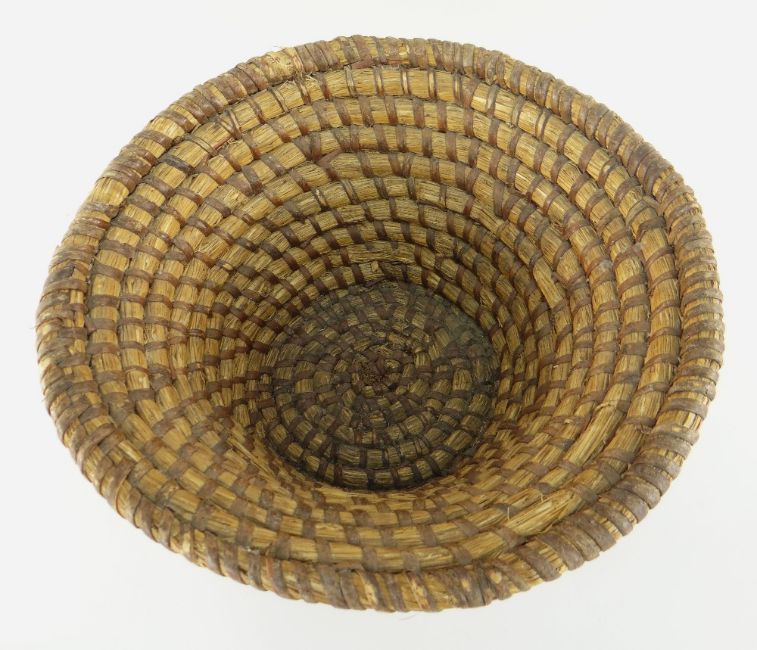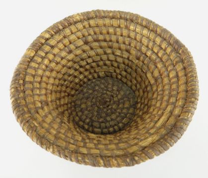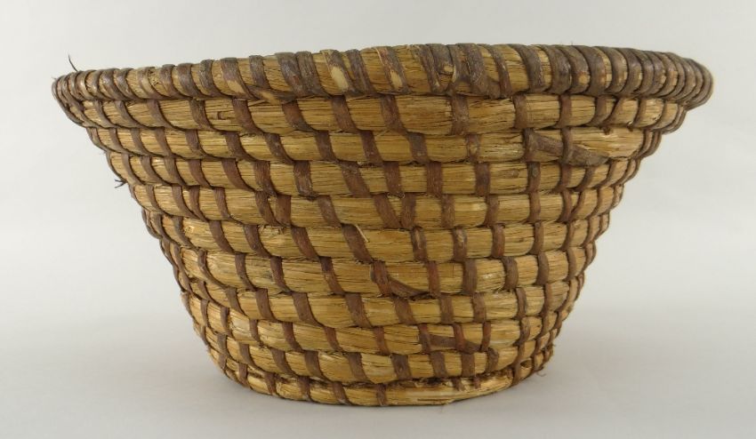 CARDIGANSHIRE LIP-WORK CIRCULAR BASKET of tapered form, traditionally crafted from wheat straw coils bound with strips of bramble, circa 1880-1910, 37cms diam at neck