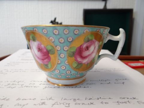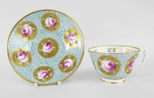 A SWANSEA PORCELAIN CUP & SAUCER decorated with a gold oeil-de-perdrix on a turquoise ground and with oval panels of pink roses, stencilled SWANSEA to base of both Condition Report: the saucer underside base has large hairline crack with dark staining. Cup has firing crack to foot. The foot rim gilding slightly worn.