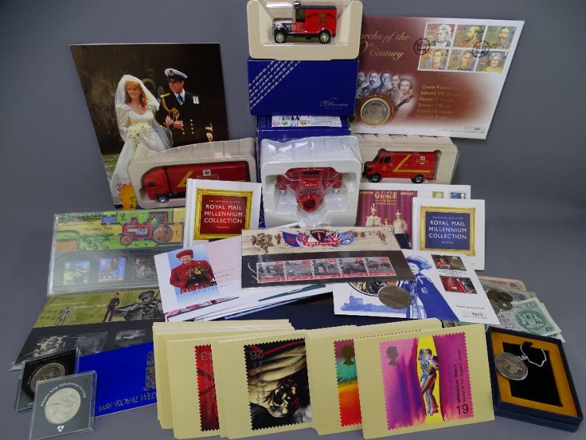 BANK NOTES, COINS, STAMPS COLLECTION - a mixed quantity to include Royal Mail Millennium collection, boxed vehicles by Corgi, twelve sets of stamps and Essential Guide Books, coin commemoratives, first day covers and celebratory stamps, two commemorative crowns with three further coins, a centenary Canadian dollar, pendant mounted on chain and six various bank notes including a Scottish £1, a Canadian $1, a Central Bank of Nigeria £1 and three Biafra notes, denominations 5 shillings, 10 shillings and £1