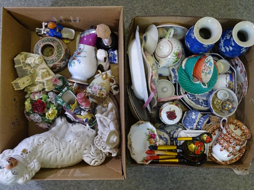 CABINET POTTERY & PORCELAIN to include cups and saucers by Aynsley, advertising ashtray for Abdulla cigarettes, a pair of oriental vases (one damaged), Staffordshire dogs and other interesting items