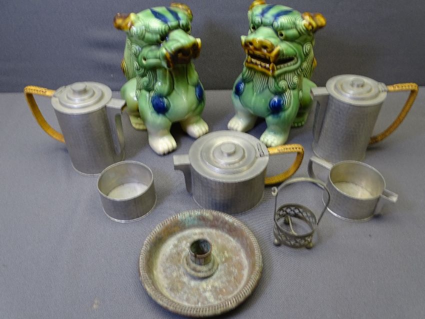 BEATEN PEWTER TEASET and a pair of Chinese pottery temple style dogs