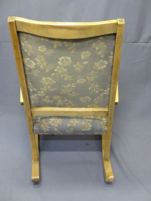 VINTAGE STYLE LIGHTWOOD ROCKING ARMCHAIR with studded edge upholstery to the back, 87cms H, 54.5cms W, 47cms seat depth