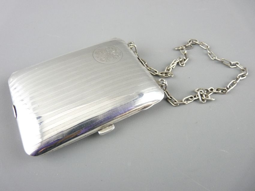 SILVER EVENING PURSE AIDE MEMOIR COMPACT COMBO with chain handle of art deco form and fine detail to hinged and gilded internal compartments. Marked 'sterling' c1920, 5.2 ozs