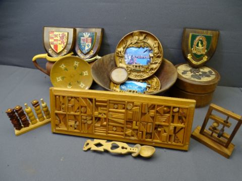 LARGE TREEN BOWL, school and university plaques, stoneware jugs and other treen items