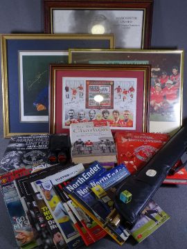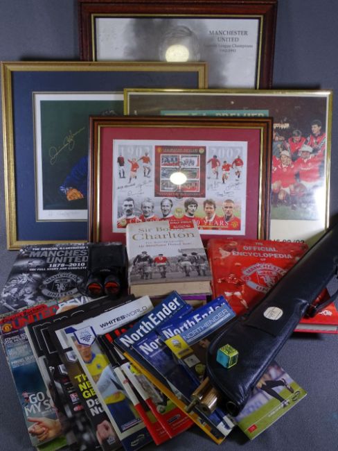 MANCHESTER UNITED INTEREST - a collector's quantity including signed prints, books, programmes along with a cased snooker cue and a pair of binoculars