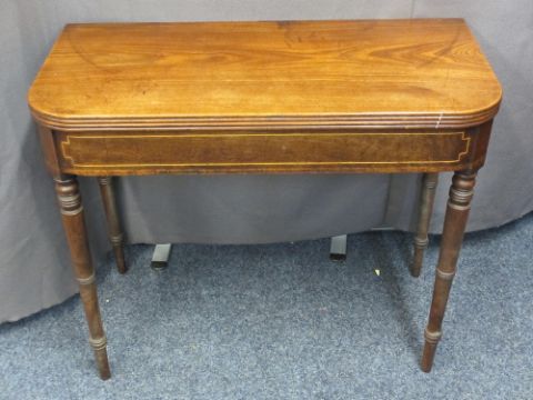REGENCY MAHOGANY FOLD-OVER TEA TABLE with boxwood string decoration on turned tapering supports, 72cms H, 86.5cms W, 41cms D closed