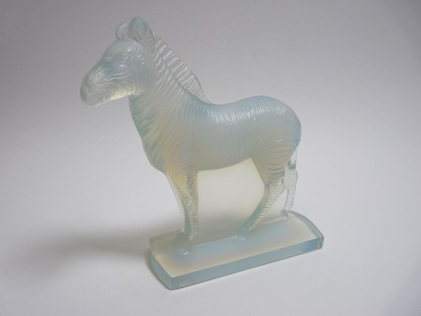 SABINO OPALESCENT GLASS CAR MASCOT- Standing ZEBRA 14cms H, 14cms L, makers marks present.
