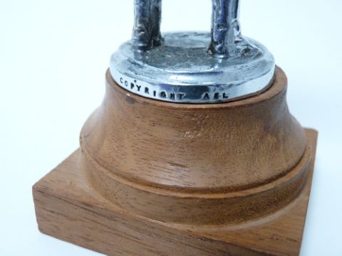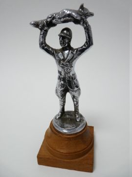 VINTAGE CAR MASCOT-HUNTSMAN WITH FOX ALOFT by A E Lejeune, stamped AEL copyright, 14.5cms H.