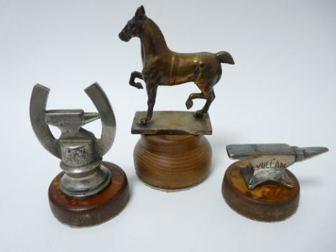 VINTAGE CAR MASCOTS X 3 - VARIOUS to include DRESSAGE/TROTTING HORSE, 11.25cms H, 10.5cms L, UNUSUAL VULCAN ANVIL ,3.5cms H, 8.5cms L and ANVIL/HORSESHOE MASCOT marked "Ye Olde Anvil - Gretna Green" circa 1920s, 9.5cms H.