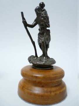 VINTAGE CAR MASCOTS X 2 St CHRISTOPHER FIGURINE to include a possibly DUNHILLS Ltdexample, silver colour on wooden stand with DUCKHAMS repair service depot badge attached, circa 1930, 14cms H, the other has a wooden staff in hand, Rd No 625077, circa 1920s, 12.5cms H.