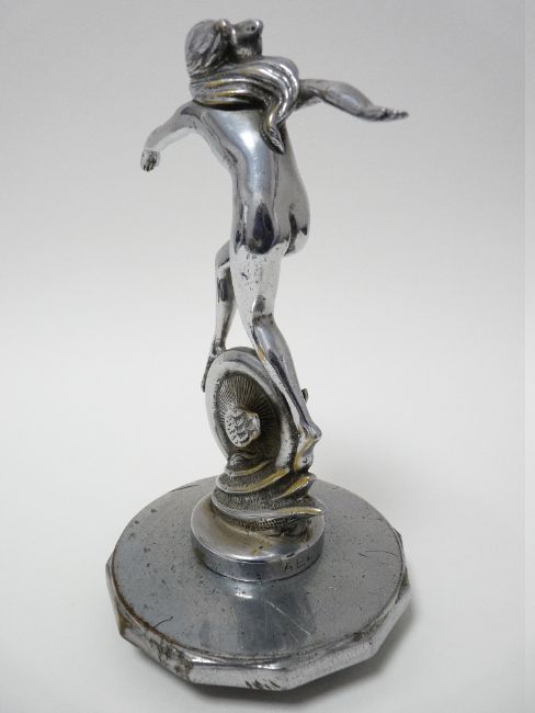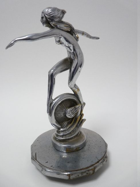 VINTAGE CAR MASCOT - FEMALE FIGURE ON WINGED WHEEL by A E Lejeune for Crossley Motors, Manchester, 1925-1930, 18cms H.