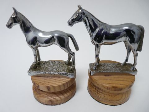 VINTAGE CAR MACOTS X 2 - STANDING HORSES by A E Lejeune, 10.5cms H, 11cms L, and DESMO,10cms H, 10cms L