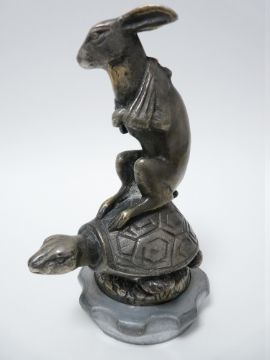 VINTAGE CAR MASCOT- HARE ON TORTOISE BACK after Henri Payne, French circa 1920, 14cms H.