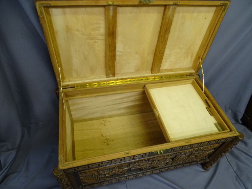 ORIENTAL CAMPHORWOOD BLANKET CHEST, heavily carved all round and with interior sliding tray and plate glass lid top.