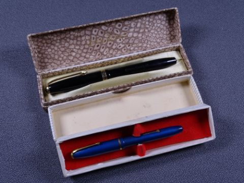 CONWAY STEWART - Vintage (late 1950s-60s) black Conway Stewart No 74 fountain pen with gold trim (Grecian style band), original 14ct gold Conway Stewart nib (No 5) and 'Speedy-Phil' filling mechanism, in original box together with a vintage 1950s blue moire Conway Stewart Dinkie No 550 fountain pen with gold trim and original 14ct gold Conway Stewart nib, in box