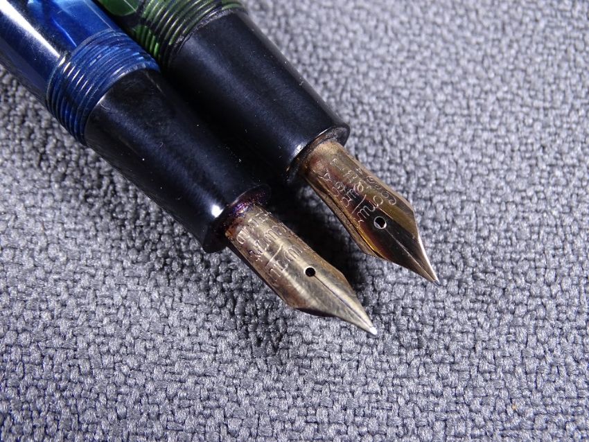 CONWAY STEWART - Two vintage (late 1950s-60s) Conway Stewart No 15 fountain pens, one having blue marble with black veins, chrome trim and 14ct gold Conway Stewart nib, the other green marble with black veins, chrome trim and original 14ct gold Conway Stewart nib (1A)