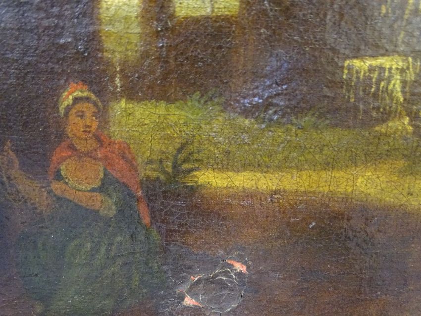 19TH CENTURY CONTINENTAL SCHOOL, oil on canvas-busy farmyard scene with numerous figures, 64x86cms