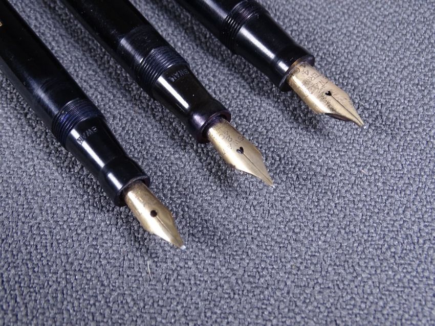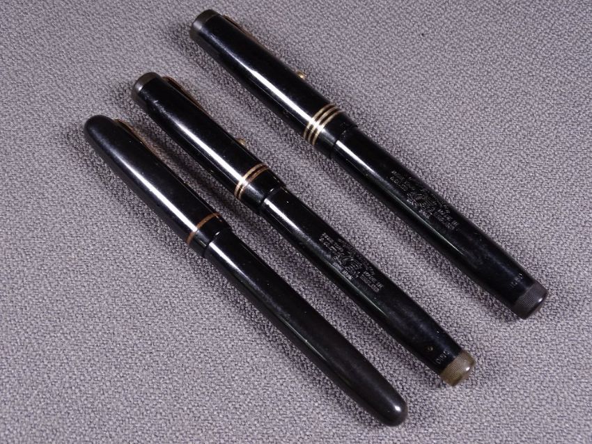 MABIE TODD - Three vintage 1940s black Swan Mabie Todd fountain pens with gold trim and 14ct gold Swan nibs, 1) black 3160 self-filler pen with No 1 nib, 2) black 0160 leverless pen with No 2 nib, 3) black 1060 leverless pen with 14ct gold Swan Eternal No 4 nib