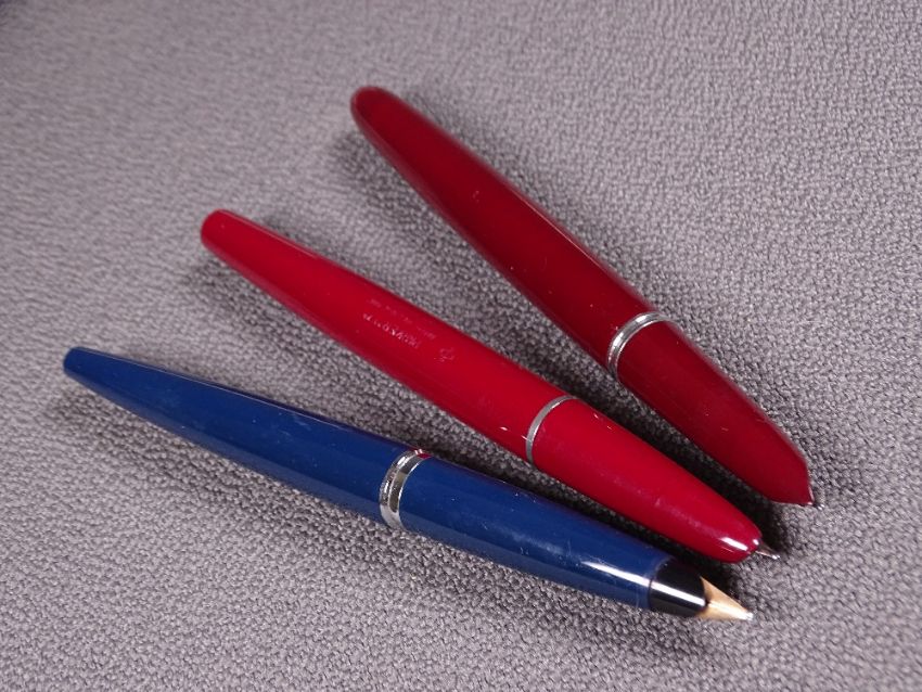 PARKER - Two vintage Parker fountain pens - 1. 1960s red Parker 17 fountain pen with gold trim and 14ct gold hooded nib, boxed and 2. 1960s-70s blue Parker 45 Classic with silver coloured metal cap, chrome trim and 14ct gold nib together with a vintage 1950s blood red Parker 51 Mk ll Aerometric fountain pen with 12ct gold filled cap, gold trim and 14ct gold nib, in original box with instructions