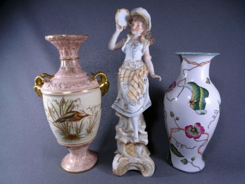 2 LARGE POTTERY VASES and a large continental China figurine of a girl with tambourine (a/f)