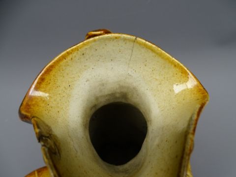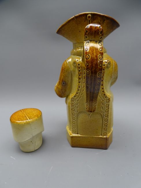 EARLY SALT GLAZED ENGLISH TOBY JUG, seated, one-armed drinking figure with top hat lid, 30 cms high, (hairline crack 4 cms long to rear of hat rim)