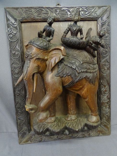 A LARGE BURMESE CARVED ELEPHANT with 3 riding figures on a carved framed panel, 57x78 cms