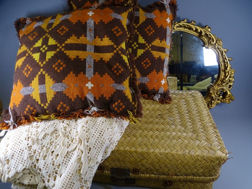 HOME FURNISHINGS-Welsh tapestry cushions, a crocheted bedspread, woven basket and a gilt frame mirror